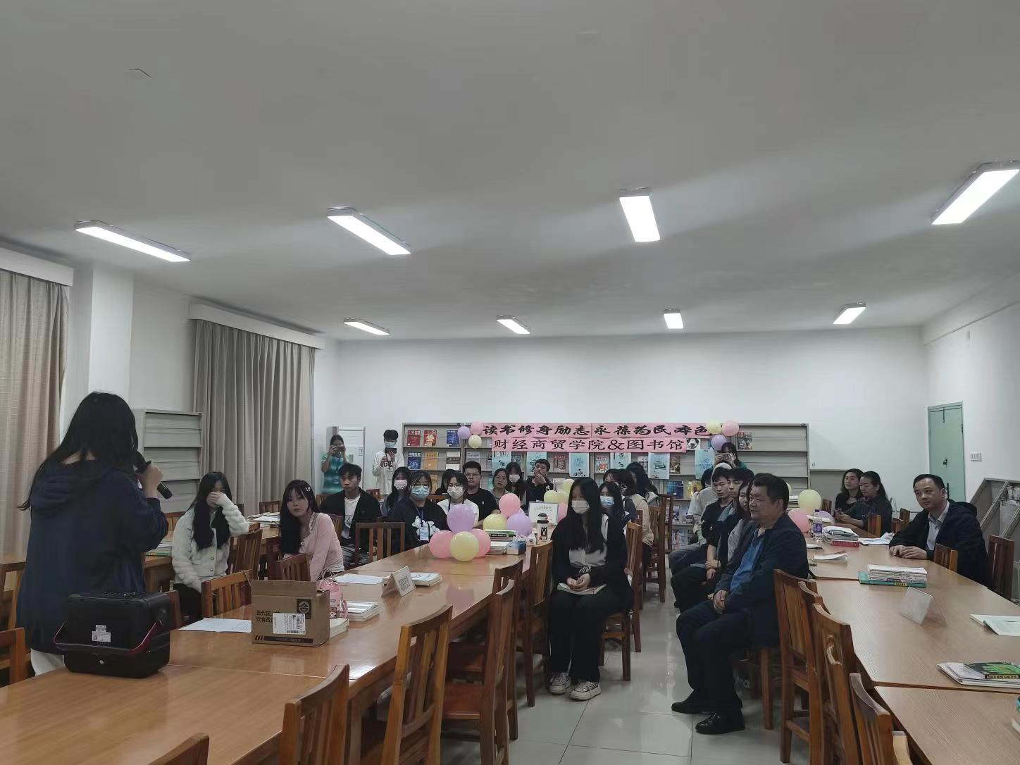 为深入学习贯彻党的二十大精神和习近平总书记关于教育工作的重要指示精神,传承楚怡职教精神,深入推进全民阅读,进一步推进书香校园建设,引导广大同学走进图书馆,爱上图书馆,养成多读书、读好书、善读书好习惯。2023年5月11日晚,财经商贸学院与图书馆在图书馆四楼阅览室联合举办了“读书修身励志,永葆为民本色”主题读书活动。财经商贸学院院长傅航、院长助理肖剑波、学生干事朱炫端,图书馆穆晓珍馆长、徐锋老师等,与读书爱好者们一起参加了本次活动。