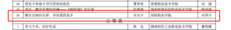 近日,湖南省教育厅发布《关于公布湖南省职业院校楚怡读书行动“主题征文”“楚怡读书之星”“最佳组织奖”评选结果的通知》(湘教通〔2023〕241号),我院获4项荣誉。“主题征文”中,教师组孙聪、刘菡婷分别荣获一等奖,学生组宋凡宇荣获一等奖,熊子怡荣获二等奖。