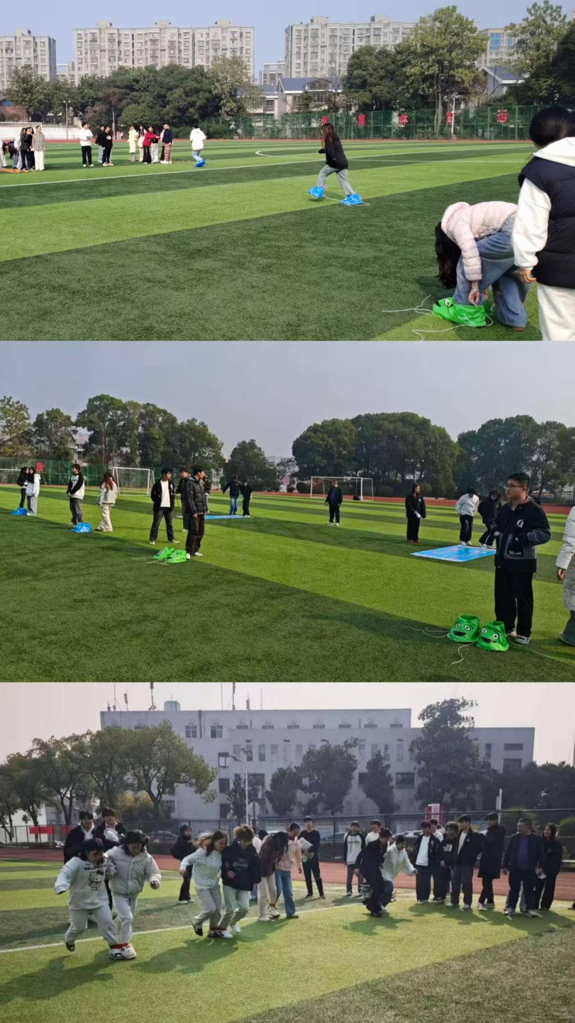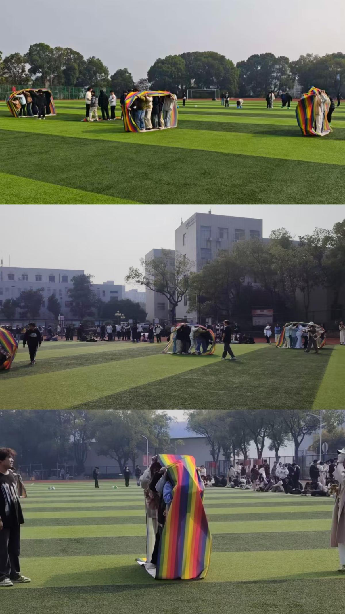 “快乐大脚”环节中,同学们套充气道具奔跑,滑稽姿态引欢呼;“无敌风火轮”环节里,彩纸“车轮”稳步前行,口号与脚步同频。这些项目让大家在协作中收获默契,在运动挥汗间卸下心理包袱。
