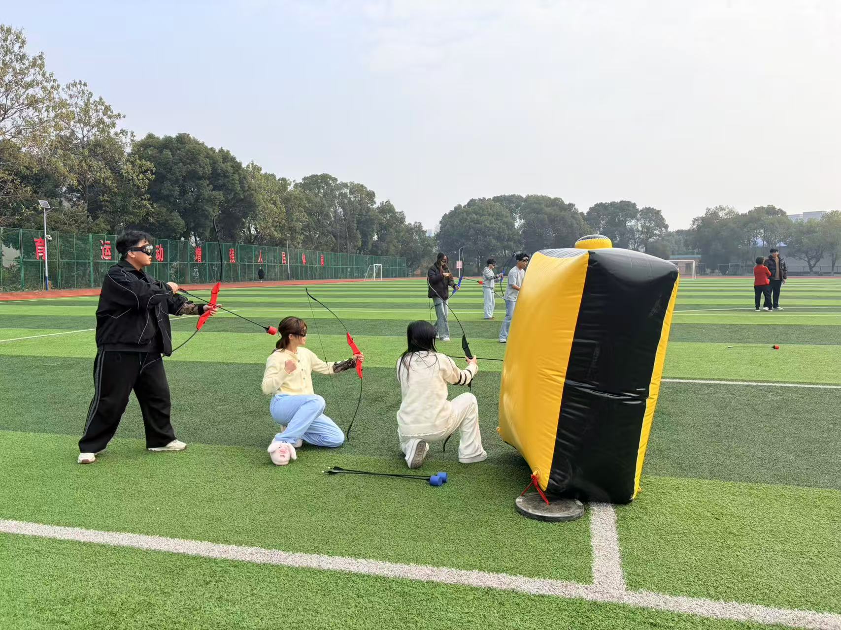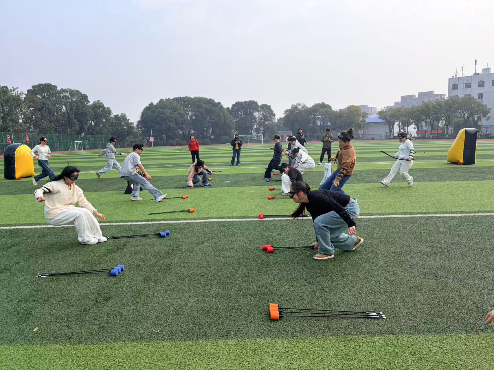 为提升班级凝聚力,助力学生全面发展,学生工作处联系思政对口班级2024级智慧健康养老服务与管理3班,于2025年12月18日中午12:30在操场举办了一场攻防箭素质拓展活动。本次活动邀请体育教研室谭俊老师作为教练,由全体学生工作处老师与对口班级的辅导员与学生共同参加。