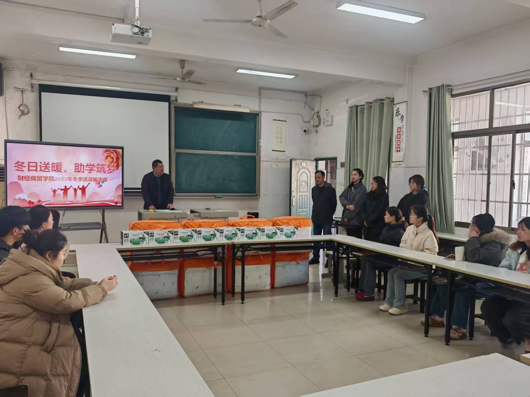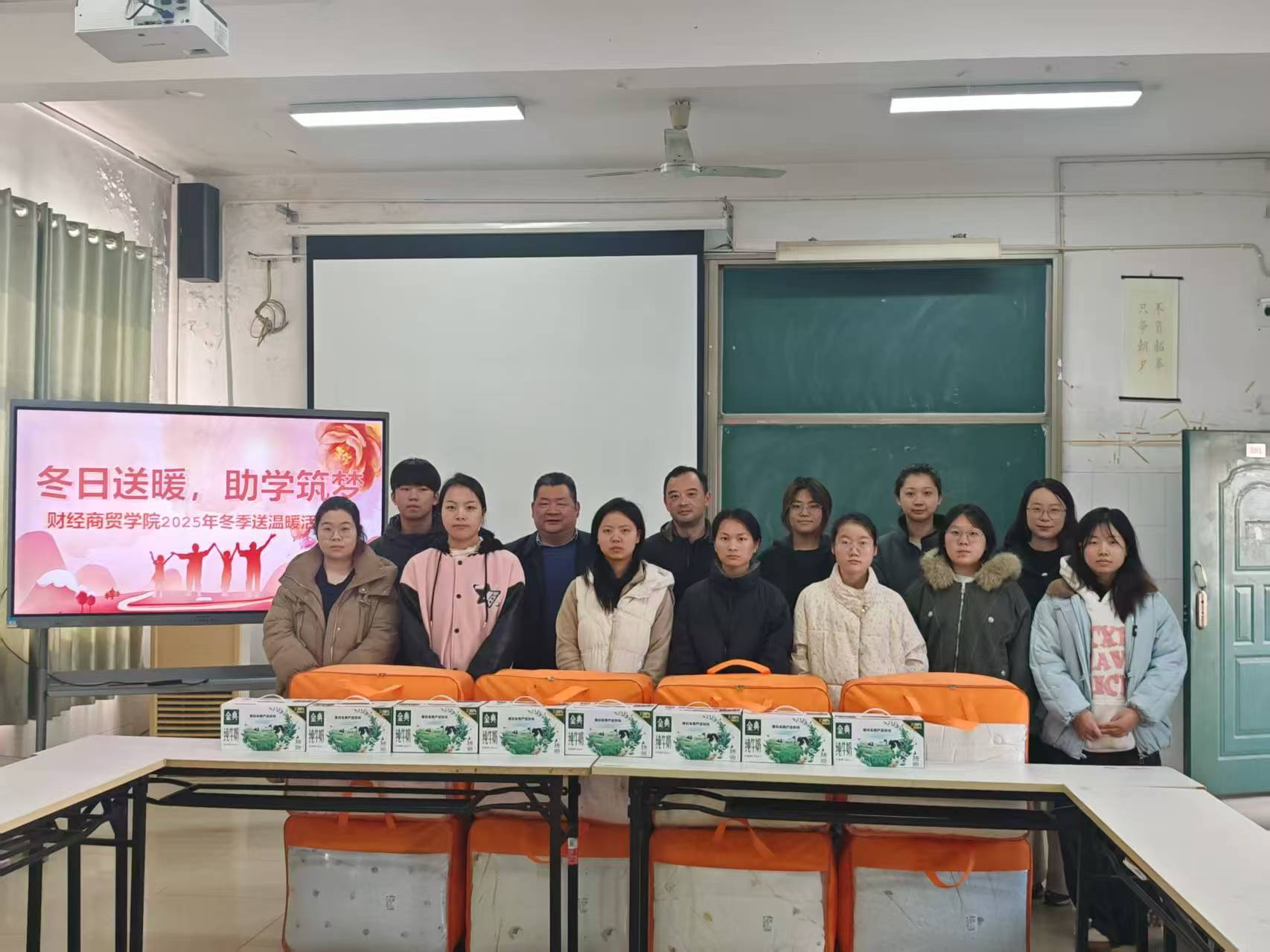 岁末寒冬,温情涌动。为扎实推进资助育人工作,切实关怀家庭经济困难学生的学习与生活,传递学院的深切关怀与温暖,财经商贸学院“冬日送暖,助学筑梦”2025年冬季送温暖慰问活动在2-301教室举行。院长傅航、学工负责人肖剑波及全体辅导员出席活动。肖剑波勉励学子们将暂时困难化为意志磨砺的财富,树立远大理想、珍惜大学时光;希望同学们以积极心态将关怀转化为奋进动力,刻苦学习练就本领,用知识改变命运,以优异成绩回报家庭与社会,传递爱心正能量。