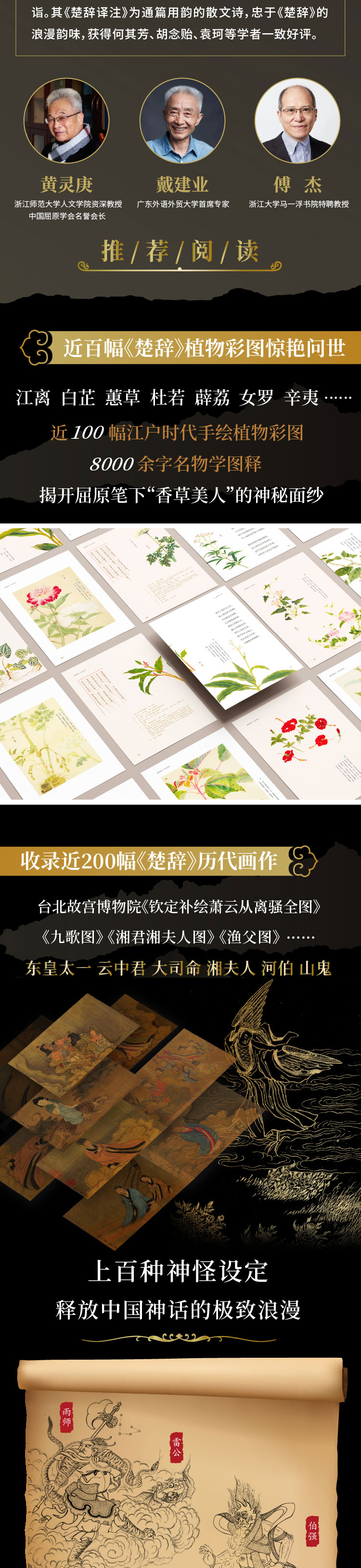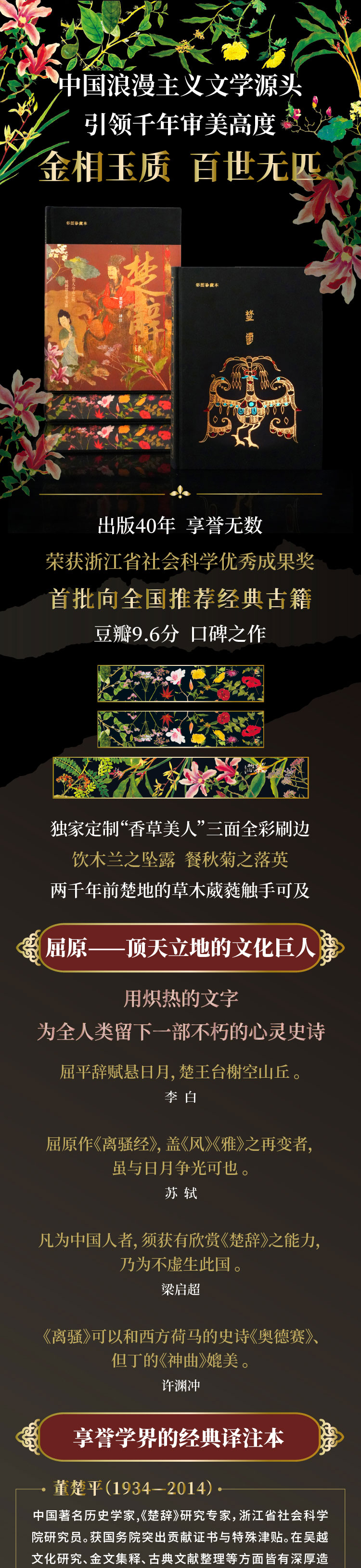 本次出版《楚辞译注(彩图珍藏本)》,包括前言、题解、原文、译文、注释、注音、彩图、图释、屈原行迹图、附录十大版块,全彩印刷。对旧版一些失韵、误译的文字进行了修订润色。收录《钦定补绘萧云从离骚全图》《九歌图》《湘君湘夫人图》《渔父图》《龙舟竞渡图》等楚辞历代彩图250余幅,其中近100幅江户时代楚辞植物彩图为首次整理面世,杜若、兰芷、江离、辛夷、杜衡、薜荔、女罗、菌桂等楚辞草木跃然纸上,带领读者揭开“香草美人”的神秘面纱。另收录《楚辞地理总图》《抽思、思美人路图》《哀郢路图》《涉江路图》《渔父、怀沙路图》5幅屈原行迹图,书末附《屈原列传》全文译注及董楚平先生考据名篇《离骚首八句考释》。全书共有2000余条注释,对神话与史实、典故与词义都有详尽的考释,生僻字上方标注拼音,董楚平先生的译诗为通篇用韵的散文诗,忠于楚辞独有的浪漫韵味,是楚辞入门的上佳读本。