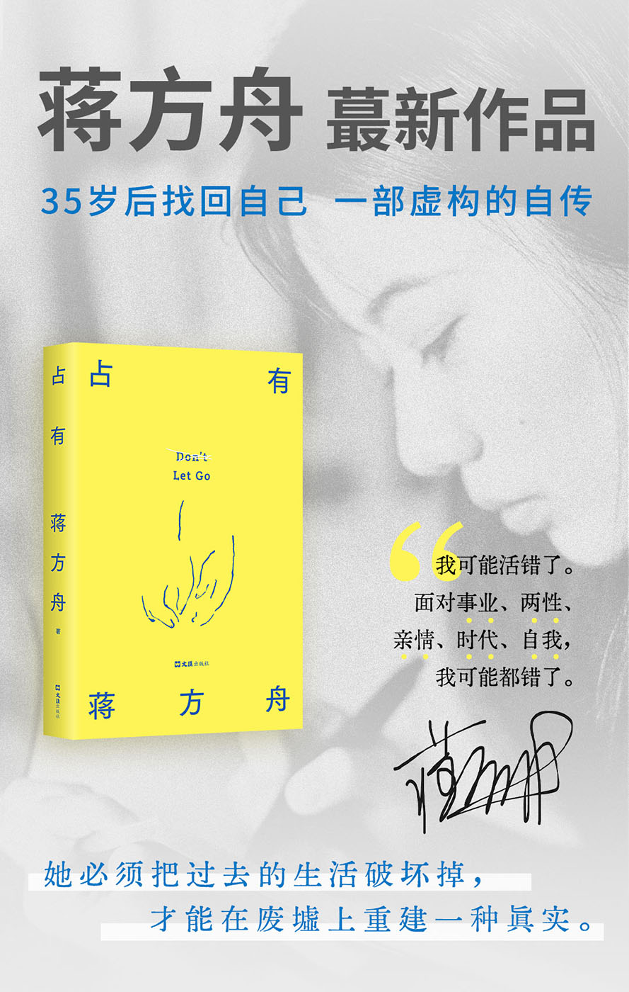 蒋方舟,青年作家。毕业于清华大学新闻与传播学院、中国人民大学创造性写作专业。第七届人民文学奖散文奖、首.届朱自清散文奖得主。出版有《我承认我不曾历经沧桑》《主人公》《占有》等十余部作品。