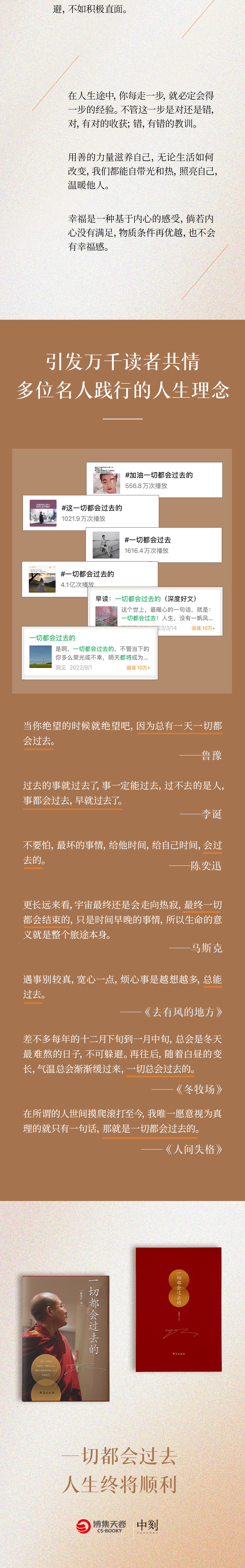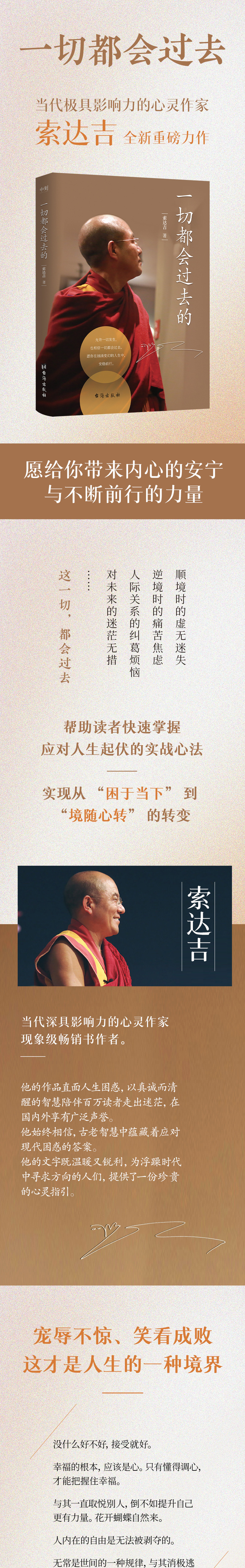 每个人的人生旅途,不可能永远一帆风顺,对于种种得失 荣辱,用不着太放在心上。被众人恭敬、名利双收时,没必要 心生傲慢,因为这些总有一天会过去;而当穷困潦倒、山穷水 尽时,也不必痛苦绝望,因为这些也会过去。 宠辱不惊、笑看成败,这才是人生的一种境界。愿索达吉的这本新书给你带来内心的安宁与不断前行的力量。